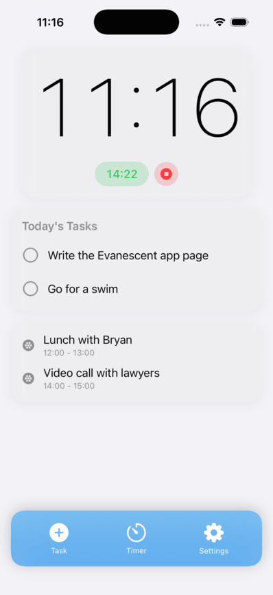 Evanescent is an app to help you focus on your day, and nothing else. It combines a clock, a list of todays tasks, your calendar for the day, and a simple timer, allowing you to stay focused and in the present and now